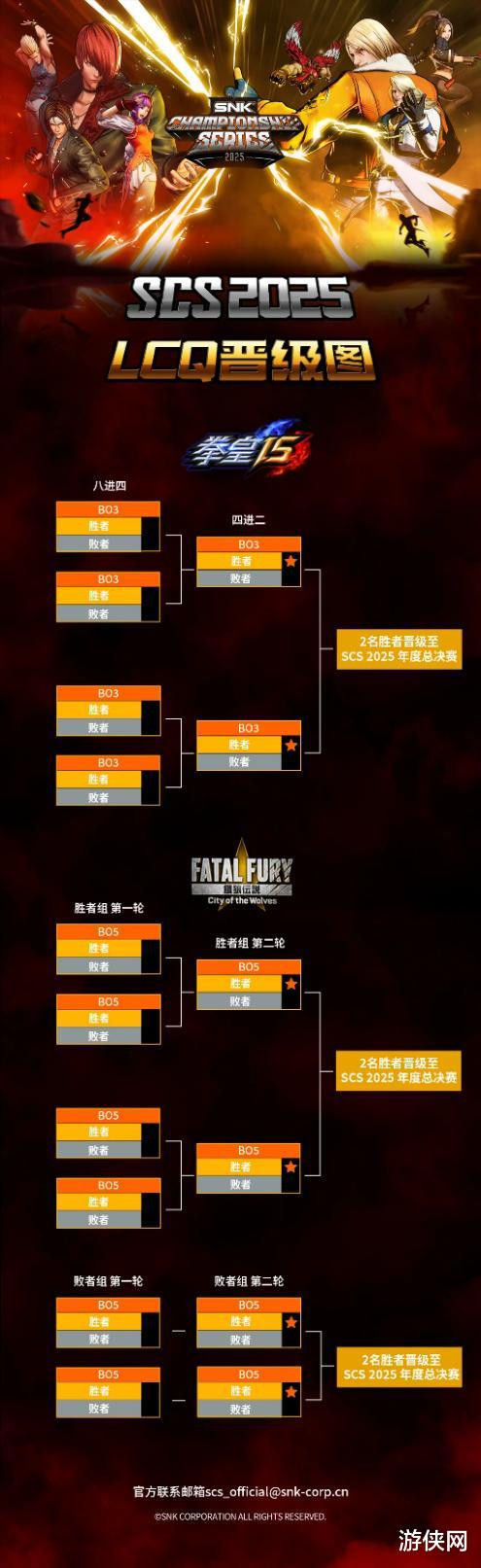 SCS 2025的升级不仅在于奖金、门票等物质奖励方面,在办赛规模与水平的层面上,今年的SCS也有重大进步,本次SCS共被分为了三大主要赛段,每一赛段都由线上常规赛阶段与线下决赛阶段组成,《饿狼传说:群狼之城》线下决赛的前四名与《拳皇15》的前三名,将获得SCS 2025年度总决赛的晋级资格。整个赛程从五月到十月高强度持续进行,保证了选手时刻有比赛打,观众随时有比赛看。
