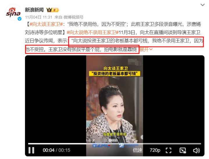 紧接着向太以投资者的角度说她不会录用王家卫。因为王家卫不受控,拍戏时间不断延长,超支也没有止境。
