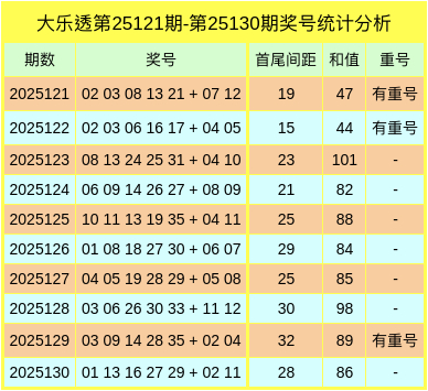 和值分析:上期前区奖号和值为86,较上期数据下降3点,开出小和值。最近10期前区奖号数据显示小和值较热,本期预计和值开在95-105区间和值。