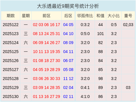 后区分析:上期后区开出号码02、11,属于偶奇数号码,本期预测开出奇奇数后区号码:01、05。