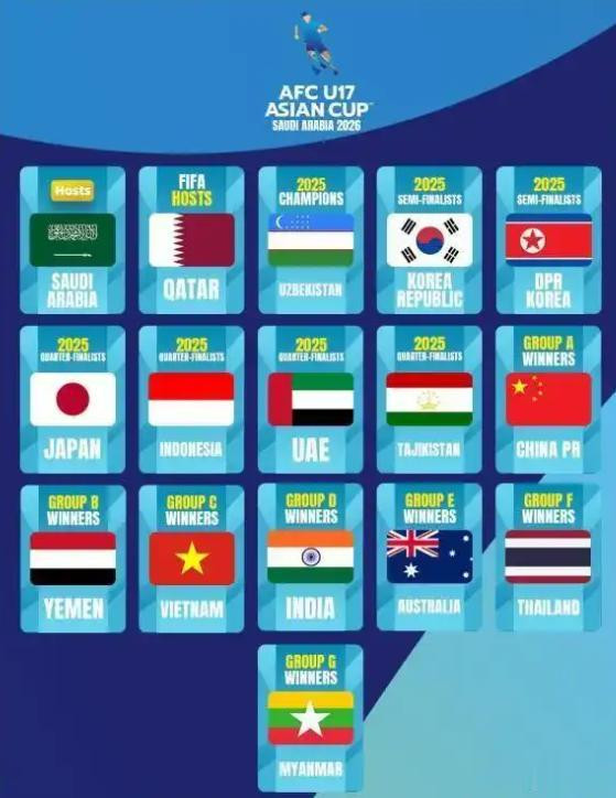 除了东道主沙特,以及已经获得世少赛资格自动入围的8支队伍之外,从预选赛中突围的7支球队分别是:中、越南、也门、泰、缅甸、澳、印度。
