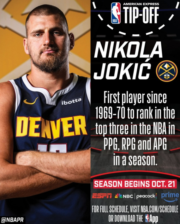 直播吧10月17日讯今日NBA官方晒出了约基奇上赛季三项主要数据都位列联盟前三的的成就海报,来为新赛季掘金揭幕战进行预热。
