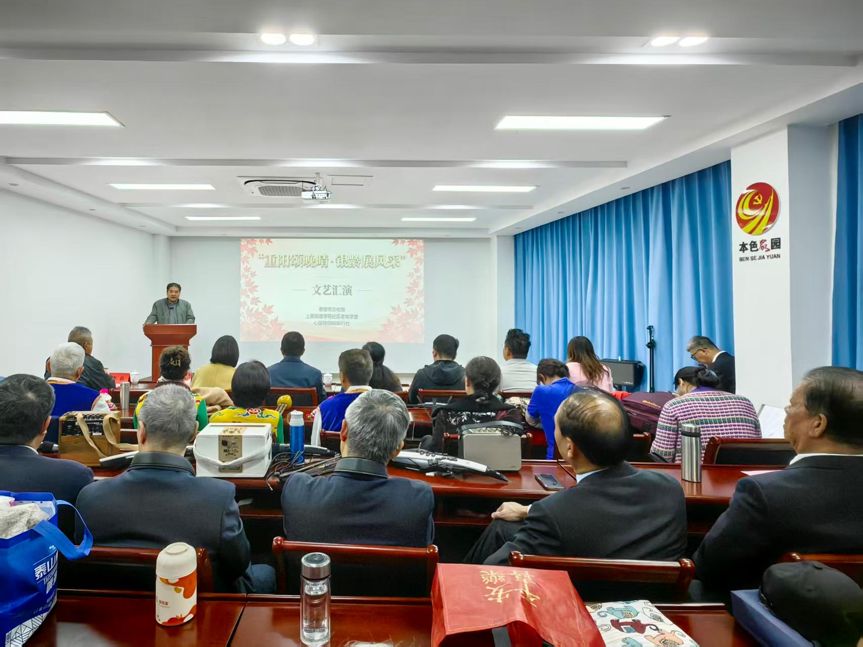 鲁网10月28日讯秋意渐浓迎重阳,晚晴正好满庭芳。为弘扬中华民族尊老敬老的传统美德,丰富老年群体精神文化生活,10月28日下午,上高街道学苑社区老年学堂联合泰安市文化馆携手心旅程国际旅行,共同举办了一场主题为“重阳颂晚晴·银龄展风采”的文艺汇演。活动有幸邀请到泰安市文化馆和泰山区老年大学及街道相关领导莅临指导。老年朋友们以歌为媒、以舞为伴,用饱满的热情和精湛的表演,展现了新时代银龄群体的活力与风采,为现场观众带来了一场精彩纷呈的文化盛宴。