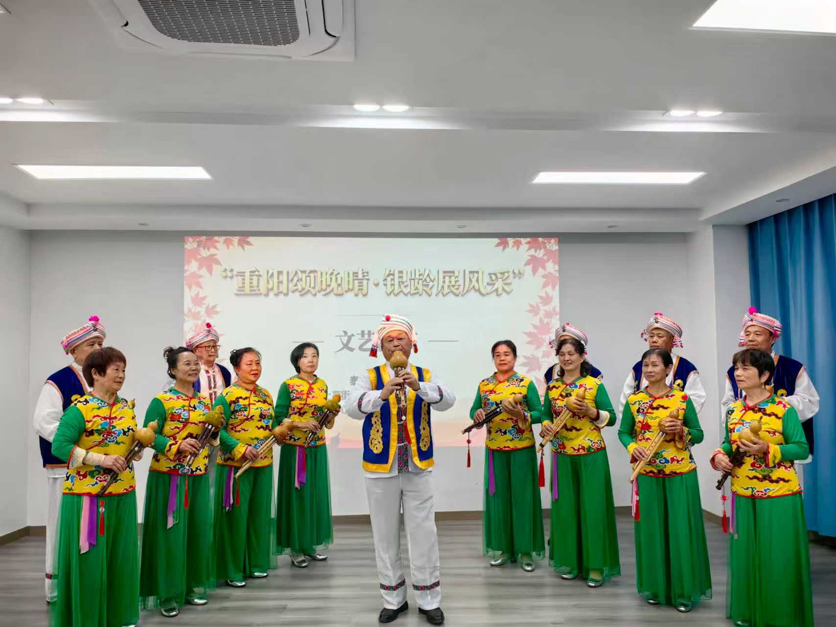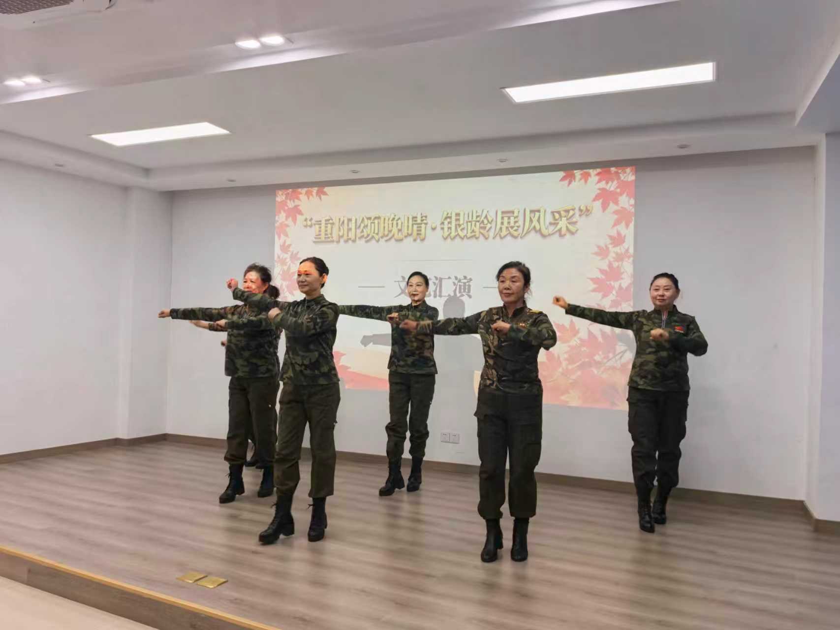 汇演在舞蹈《绿色军衣》中正式拉开序幕。社区老年学堂的学员们身着整齐服饰,精神矍铄、身姿挺拔,一招一式间尽显军人的刚毅风采,将对军旅岁月的怀念与崇敬融入每一个舞步,刚劲有力的表演瞬间点燃了现场气氛。紧随其后,女声独唱《奋斗的时代在一起》,嘹亮的歌声铿锵有力,唱出了新时代的奋进节拍,更传递出老年人不服老、勇追梦的昂扬斗志;葫芦丝合奏《竹楼情歌》悠扬婉转,学员们指尖轻舞,傣家竹楼的清幽意境与民族风情缓缓流淌,让观众沉浸在诗意的旋律之中;社区工作人员的重阳三句半,成了专属节日的温暖点缀;男声独唱《伊犁河的月亮》深情款款,醇厚的嗓音勾勒出西北大地的辽阔与静谧,满含思念与深情的演绎打动了在场每一位观众,掌声与欢呼声经久不息,文艺汇演在大合唱《最美夕阳红》中落下帷幕。