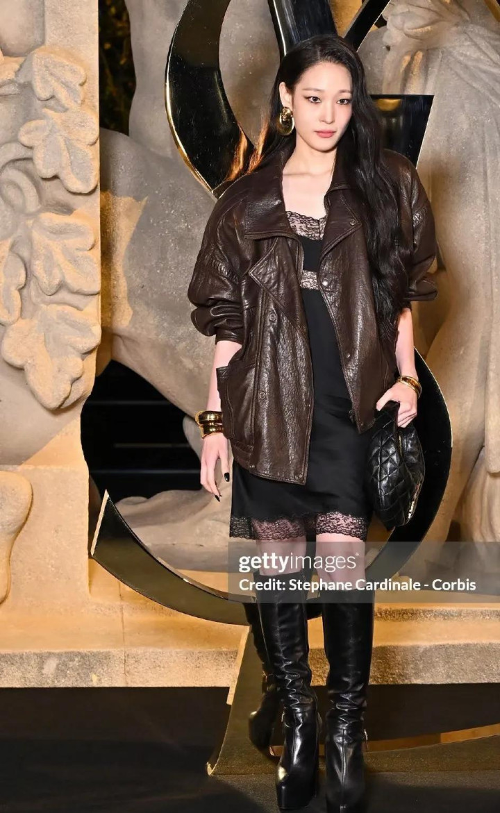 文徐允一身棕色皮衣搭配黑色长靴亮相,她个子高挑,气场强大,身上散发着一种高智感和疏离感,时尚感爆棚,像韩剧中的财阀千金,当然人家就是真财阀千金。